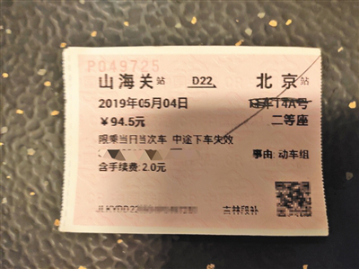 5月4日,五一假期返程高峰。新京报记者购买短途火车票,体验“买短乘长”,进站后只需补票并缴纳2元手续费后,即可乘往终点。律师表示,旅客自购买车票后,事实上就已与铁路部门形成了运输合同关系,因为铁路部门的原因,导致旅客没有按时乘坐火车,系铁路部门违反了合同的约定,应当承担违约责任。