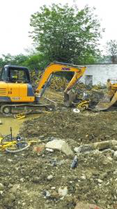 一辆挖掘机在清理报废共享单车。