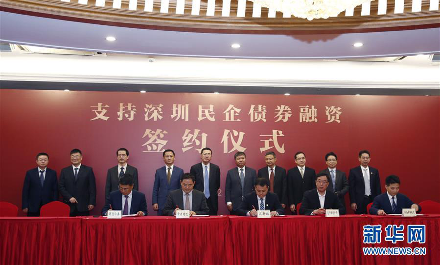 在深圳高新投发起的支持深圳民企债券融资签约仪式上,五家金融机构正在签约(2019年2月28日摄)。 新华社发