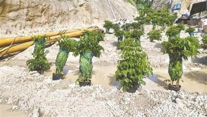 福建省漳浦县非法开采企业将大量盆栽苗木简单覆土,甚至直接摆放在砂场,搞“盆栽式复绿”。