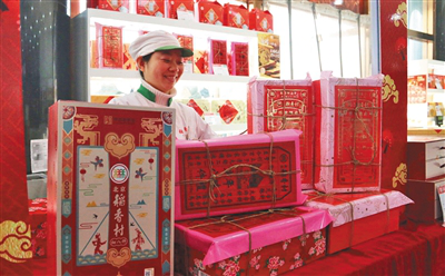 稻香村工作人员展示礼品套盒“京八件”、“细八件”。记者 陈琳 摄