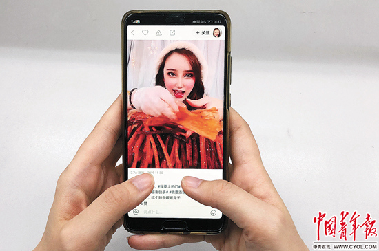 一位消费者在查看手机里关于网红食品的视频。中青报·中青网记者 李峥苨/摄