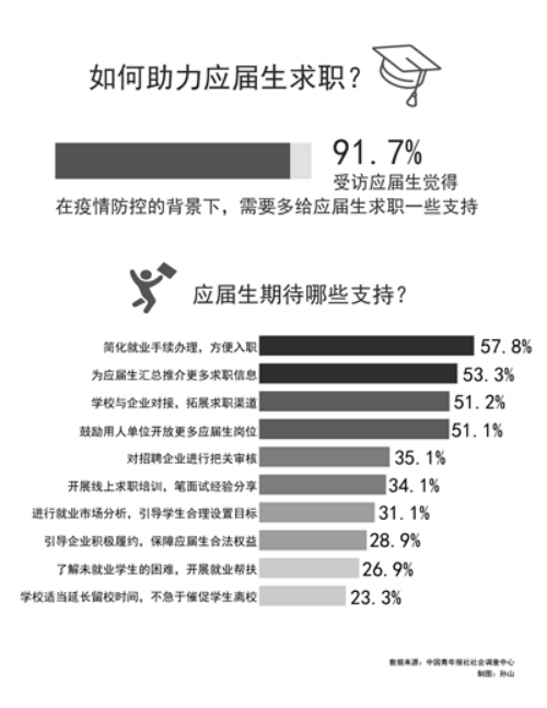 调查中,91.7%的受访应届生觉得,在疫情防控的背景下,需要多给应届生求职一些支持。