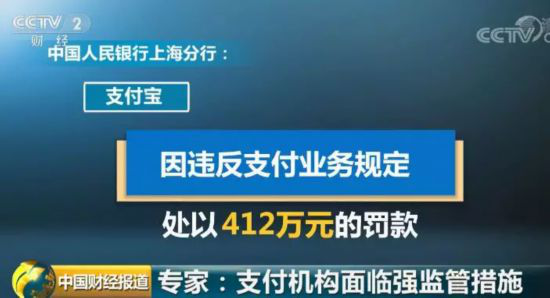 支付宝因违反支付业务规定,被处以412万元的罚款。
