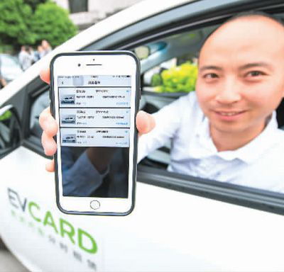 一名技术人员在演示通过“E+租车”APP找到附近可以使用的分时租赁电动汽车信息。新华社记者 刘 潺摄