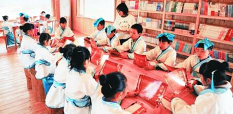 江西省贵溪市塘湾镇夏家村在新农村建设过程中在原塘湾书院的遗址上新建了11栋小木屋,定期邀请当地文化名人进行授课。图为该镇中心学校老师每周末组织的诵读国学经典活动。刘永华摄/光明图片