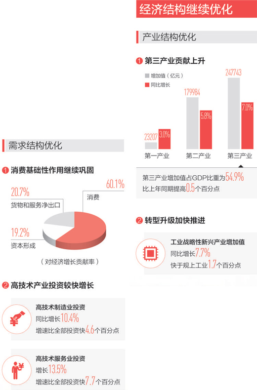 需求结构在优化。消费的基础性作用继续巩固,上半年最终消费支出对经济增长的贡献率达到60.1%,在全部居民最终消费支出中,服务消费占比为49.4%,比上年同期提高0.6个百分点。投资的结构也呈现优化的趋势,比如社会领域的投资、高技术产业的投资、制造业技术改造的投资都保持在10%以上的较好的水平。