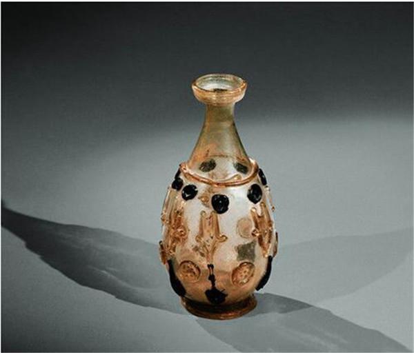盘口细颈贴塑淡黄色琉璃瓶和罗马丹芭纹描金蓝色琉璃盘,就是其中的两件。