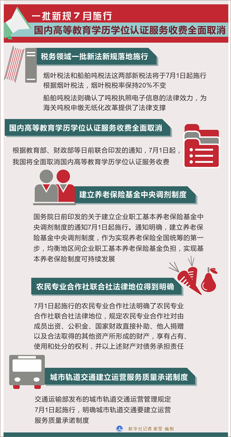 降低1449个税目的日用消费品进口关税,取消国内高等教育学历学位认证服务收费,建立企业职工基本养老保险基金中央调剂制度……7月,一批便民利民的新法新规将正式施行。