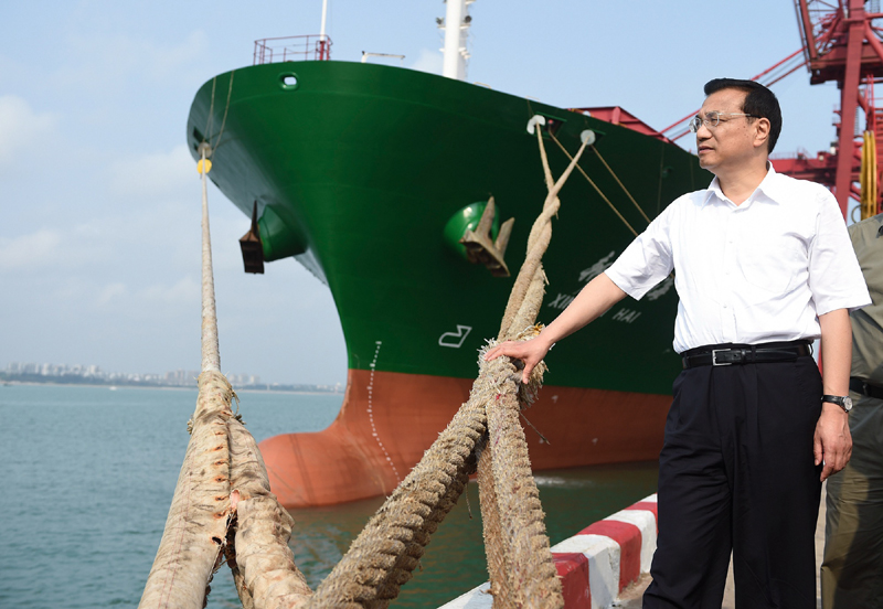 图为李克强总理在海口港码头了解货物吞吐量及运输等情况。