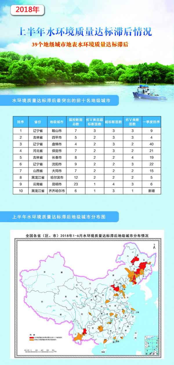 据生态环境部网站消息,根据地表水环境质量监测数据,2018年上半年,共有39个及以上地级城市地表水环境质量达标滞后,完成年度目标任务难度较大。