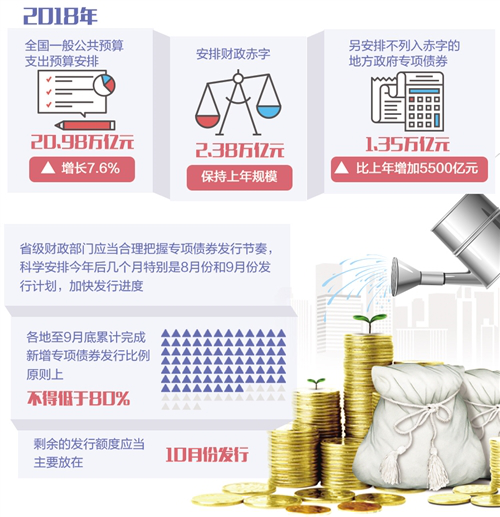 2018年继续实施积极财政政策是党中央、国务院确定的宏观政策取向。根据中央经济工作会议和《政府工作报告》确定的2018年经济发展目标,今年全国一般公共预算支出预算安排20.98万亿元,增长7.6%;安排财政赤字2.38万亿元,保持上年规模。另安排不列入赤字的地方政府专项债券1.35万亿元,比上年增加5500亿元。
