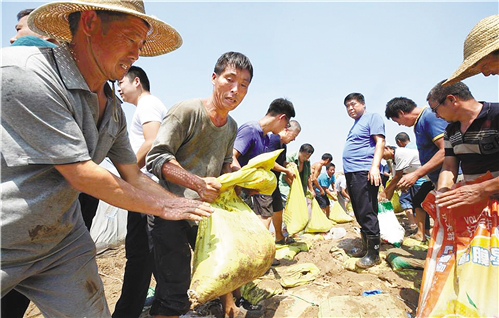 山东寿光村民正在装填沙袋、筑坝挡水。赵德彦 摄