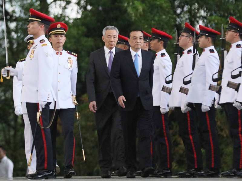 当地时间11月12日下午,李显龙总理在新加坡总统府广场举行隆重仪式,欢迎李克强总理对新正式访问。当国宾车队抵达时,李显龙在国宾车前迎接李克强总理。两国总理一起登上检阅台。军乐队先后奏响中新两国国歌。李克强在李显龙的陪同下检阅了仪仗队。