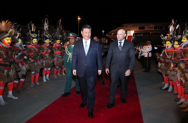 当地时间晚8时05分许,习近平乘坐的专机抵达莫尔兹比港杰克逊国际机场。习近平步出舱门,现场响起热烈的掌声,巴布亚新几内亚副总理埃布尔率政府高级官员在舷梯旁热情迎接。巴布亚新几内亚少年向习近平献上鲜花。红地毯两侧,英姿飒爽的礼兵昂首伫立。当地舞蹈演员头戴羽饰,腰系草裙,手持皮鼓,跳起热情洋溢的迎宾舞蹈。自发赶来的当地民众、中资企业员工和华侨华人簇拥在机场外和中国代表团下榻处,挥舞着中国国旗,热烈欢迎习近平。