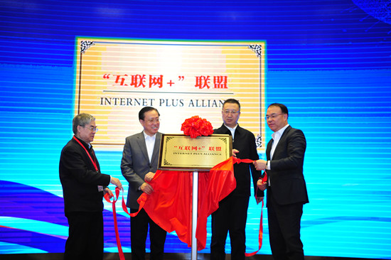 国家发展改革委副主任林念修(左二)、工业和信息化部总经济师王新哲(右二)、中国工程院院士邬贺铨(左一)、中船重工集团副总经理何纪武(右一)共同为“互联网+”联盟成立揭牌。