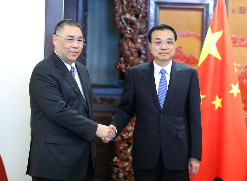 国务院总理李克强12月17日上午在中南海紫光阁会见来京述职的澳门特别行政区行政长官崔世安,听取澳门当前形势和特别行政区政府工作情况的汇报。