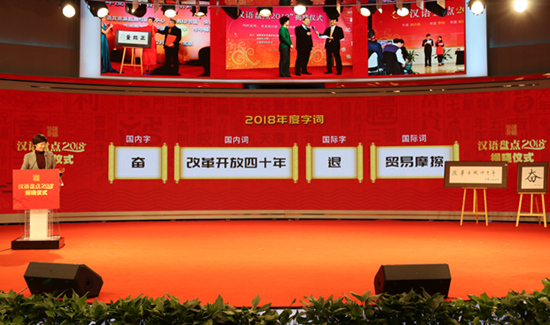 12月20日电,由国家语言资源监测与研究中心、商务印书馆、人民网、腾讯公司联合主办的“汉语盘点2018”揭晓仪式于今天上午在人民日报社新媒体大厦举行。“奋”“改革开放四十年” 当选年度国内字、国内词,“退”“贸易摩擦”当选年度国际字、国际词。