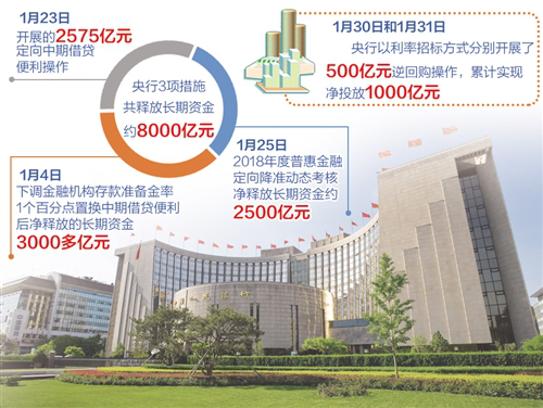 公告显示,1月25日,央行开展了2018年度普惠金融定向降准动态考核。此次动态考核净释放长期资金约2500亿元,再加上1月4日央行宣布下调金融机构存款准备金率1个百分点置换中期借贷便利后净释放的长期资金3000多亿元,以及1月23日开展的2575亿元定向中期借贷便利操作,上述3项措施共释放长期资金约8000亿元。