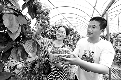 浙江省德清县下渚湖街道伟强家庭农场,游客在采摘樱桃。光明图片