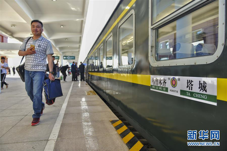 5月30日,在新疆塔城火车站,旅客准备登上塔城—乌鲁木齐K9858次列车。新华社发(摆风亮 摄)