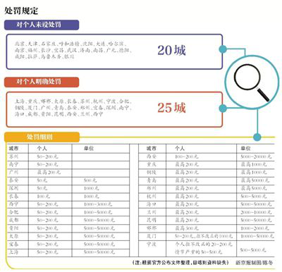 记者统计发现,46个重点城市中,有25个城市明确了对个人和单位违规投放生活垃圾的处罚。其中,大部分已对垃圾分类立法的城市,都在相关条例中明确了对个人违规投放的处罚。