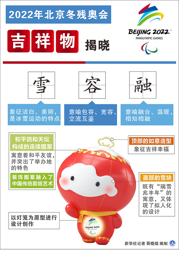 2022年北京冬残奥会吉祥物“雪容融”17日正式发布。“雪容融”形象来源于灯笼。灯笼具有鲜明的中国文化特色,有着2000多年的悠久历史,是世界公认的“中国符号”。它是欢乐喜庆节日气氛和 “瑞雪兆丰年”美好寓意的完美结合,表达了共同参与、共同努力、共同享有的办奥理念。