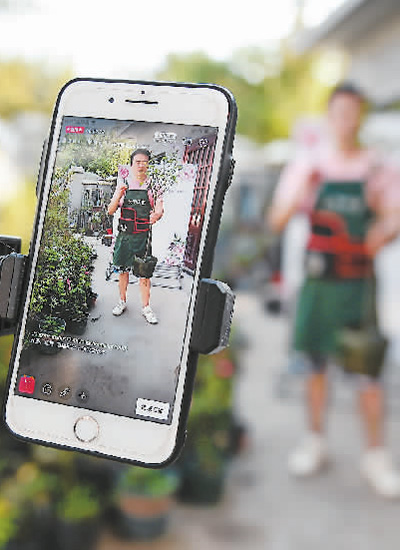 江苏省宿迁市沭阳县,一名花农正在家门口直播销售月季花。新华社记者李响摄