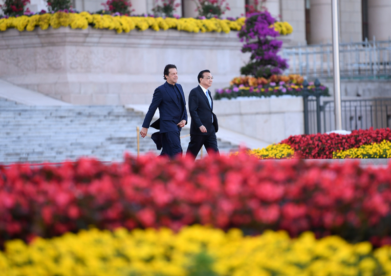 国务院总理李克强10月8日下午在人民大会堂同来华出席2019年中国北京世界园艺博览会闭幕式并进行工作访问的巴基斯坦总理伊姆兰·汗举行会谈。