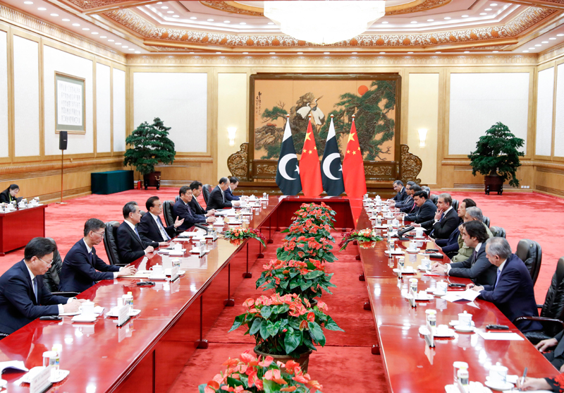 李克强首先就巴基斯坦前不久遭受严重地震灾害向巴政府和人民致以诚挚慰问。他表示,中国和巴基斯坦是全天候战略合作伙伴,中巴友好有深厚和坚实的基础,不附加任何条件、不针对任何第三方,得到两国人民发自内心的拥护和支持。中方高度重视总理先生此次访华,习近平主席将同你举行会见。中方始终把中巴关系置于周边外交的优先方向,坚定支持巴方捍卫国家独立、主权、领土完整和合法权益,支持巴方推进国家繁荣振兴事业,支持巴方在国际和地区事务中发挥更大作用。我们愿同巴方共同努力,继续深化战略互信,拓展务实合作,密切人文交流,推动两国关系与合作迈上新台阶。