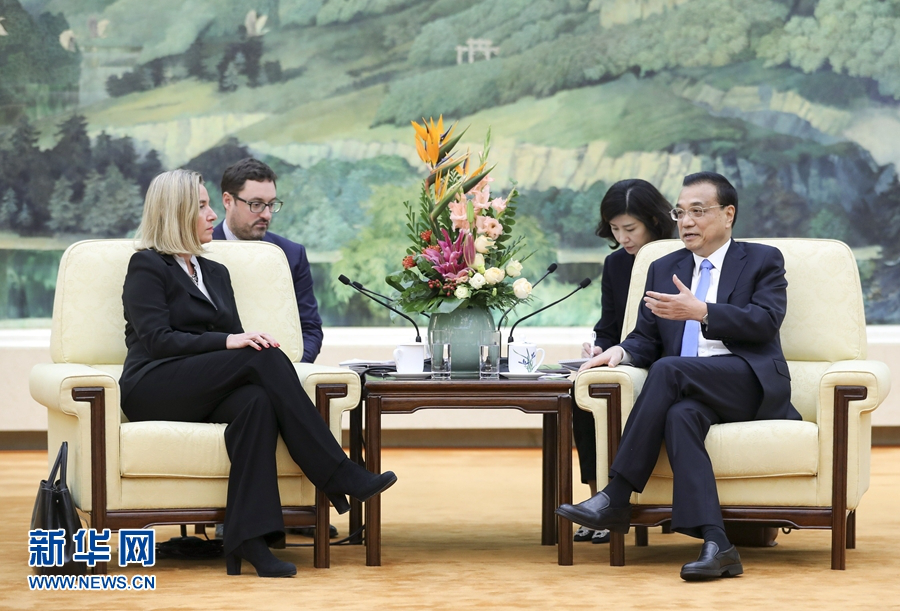 10月24日,国务院总理李克强在北京人民大会堂会见欧盟委员会副主席、欧盟外交与安全政策高级代表莫盖里尼。新华社记者 丁林 摄