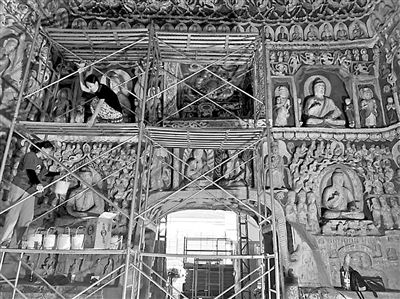 3D打印出来的“音乐窟”虽然有砂岩的质感,却没有颜色,无法表现出“音乐窟”艳丽的色彩,“为此我们进行了一段艰苦的上色工作。”宁波说,“上色是没法用计算机进行的,只能靠人工进行,5名工作人员用了8个月时间,才完成上色。”