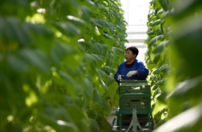 12月11日,河北省南和县贾宋镇一家现代农业示范园区工人在智慧温室内工作。