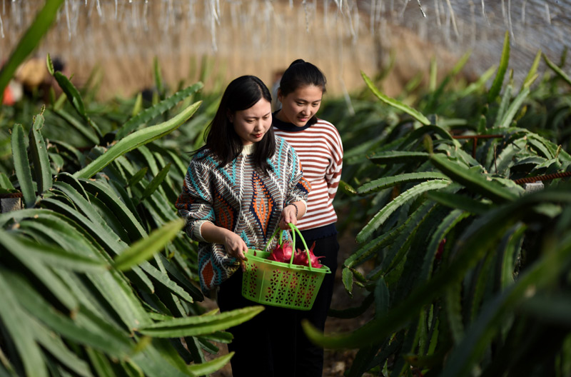 12月11日,游客在河北省南和县郝桥镇一家现代农业示范园区采摘火龙果。
