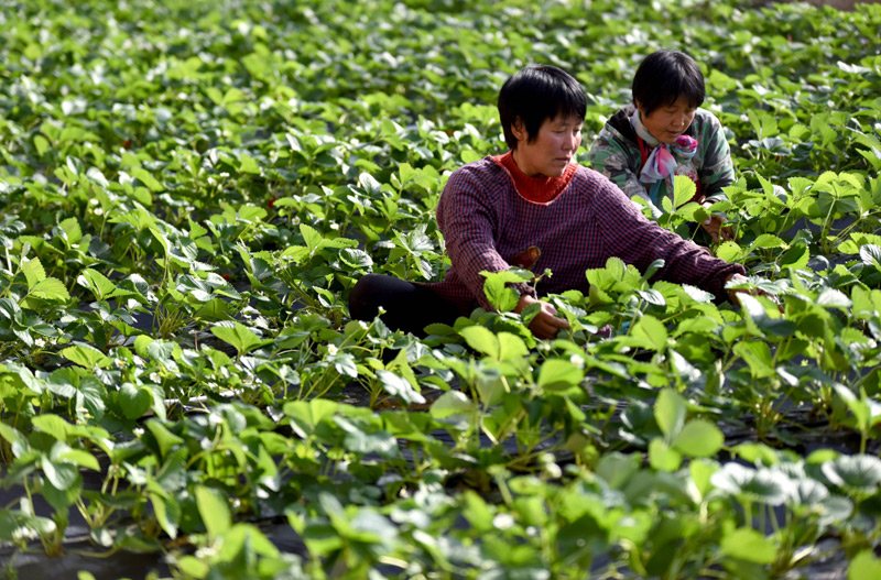 12月11日,河北省南和县郝桥镇一家现代农业示范园区工人在温室内管理草莓。