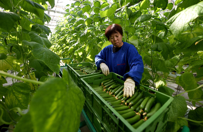 12月11日,河北省南和县贾宋镇一家现代农业示范园区工人在蔬菜库房内工作。