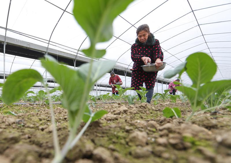 1月4日,贵州省铜仁市玉屏侗族自治县新店镇洞坪村村民在大棚里给花菜施肥。