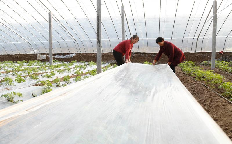 1月4日,河北省邢台市南和区和阳镇郑庄村的村民在大棚里为西红柿秧苗覆膜。