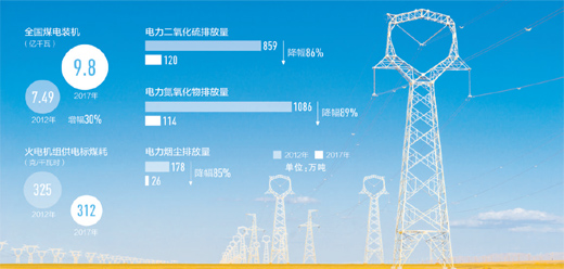 ——排放少了、煤耗低了。国家能源局电力司有关负责人介绍,2012年至2017年,全国煤电装机由7.49亿千瓦增长至9.8亿千瓦,在增幅达30%的情况下,电力二氧化硫、氮氧化物、烟尘排放量从859万吨、1086万吨、178万吨下降至120万吨、114万吨、26万吨,降幅分别达86%、89%、85%。火电机组供电标煤耗从325克/千瓦时下降至312克/千瓦时。据此测算,2017年节约原煤约8300万吨。