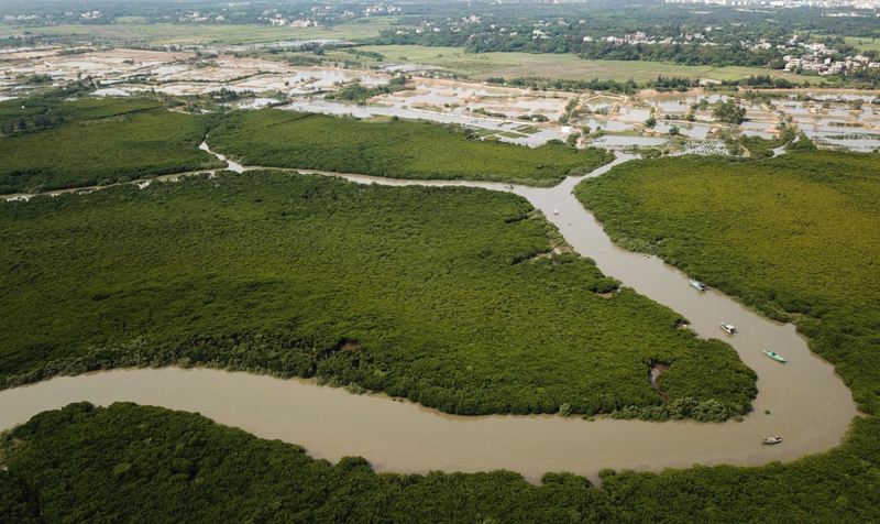 在海南东寨港国家级自然保护区,部分鱼塘已完成退塘工作(3月22日无人机拍摄)。