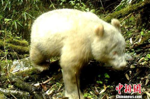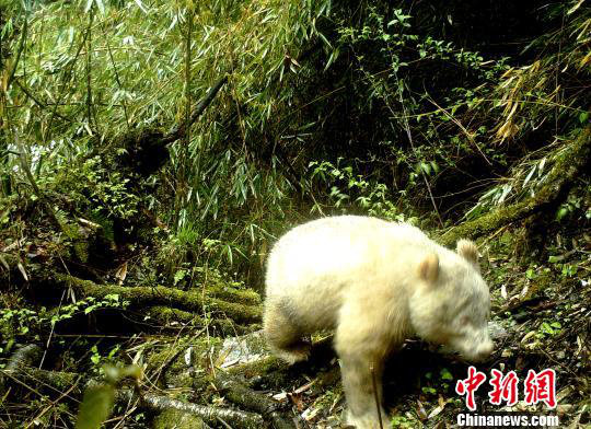 四川卧龙国家级自然保护区管理局于25日对外发布全球首张白色大熊猫照片。这张白色大熊猫照片是保护区内海拔2000米左右的一台野外红外触发相机,于4月中旬下午摄录下的一张大熊猫影像,图片清晰显示出这只大熊猫独特的形态特征:毛发通体呈白色、爪子均为白色,眼睛为红色,正穿过郁郁葱葱的原始落叶阔叶林。据专家分析,根据照片上这些外部特征,可以判断该大熊猫是一只白化个体。从体型判断,这是一只亚成体或青年大熊猫,年龄大概在1-2岁左右。