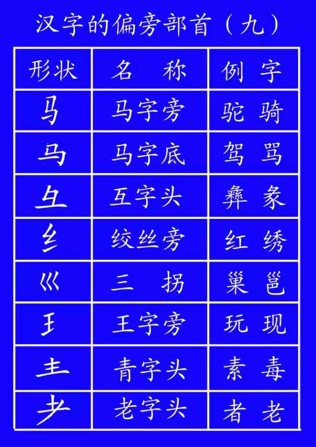 土(培场)、王(玩球)、止(歧武)、血(衅衄)、耳(取、联)、子(孙、孩)、马(驰、驶)、鸟(鸵)。