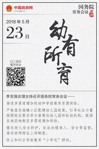 当天会议部署多渠道增加学前教育资源供给。这一内容也写入今年的《政府工作报告》。总理在常务会上强调,发展学前教育要坚持多条腿走路。
