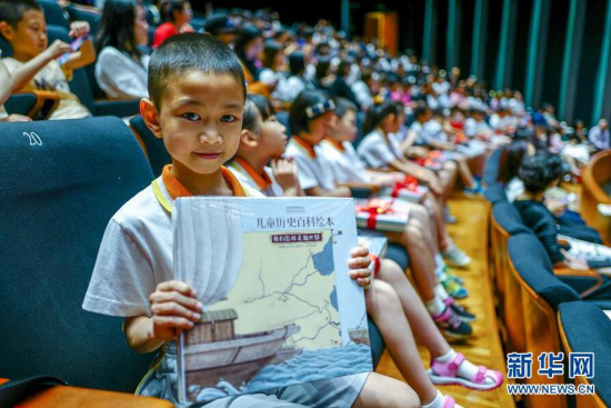 在发布会现场,一名参加活动的小学生代表在展示获赠的新书。