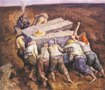 这件水彩作品一经面世就受到极大关注,当年便摘得第九届全国美术作品展览金奖,此后还荣获广东省美协50年50件经典作品奖、广东省第七届鲁迅文学艺术奖等奖项。作品以厚重朴实的造型和纪念碑式的表现手法,将劳动人民艰苦创业的形象镌刻在时代丰碑上。同时,无论是画面的精心组织还是水彩语言的开拓,又都独具匠心。创作者、画家黄增炎表示,他首先对水彩画纸进行加工,涂上黏性较强的白色底料;同时把画笔换成刷子,一扫普通水彩画的纤弱,大笔挥洒自由奔放,颜料还加入了适量的胶合剂,使得画面更富肌理。