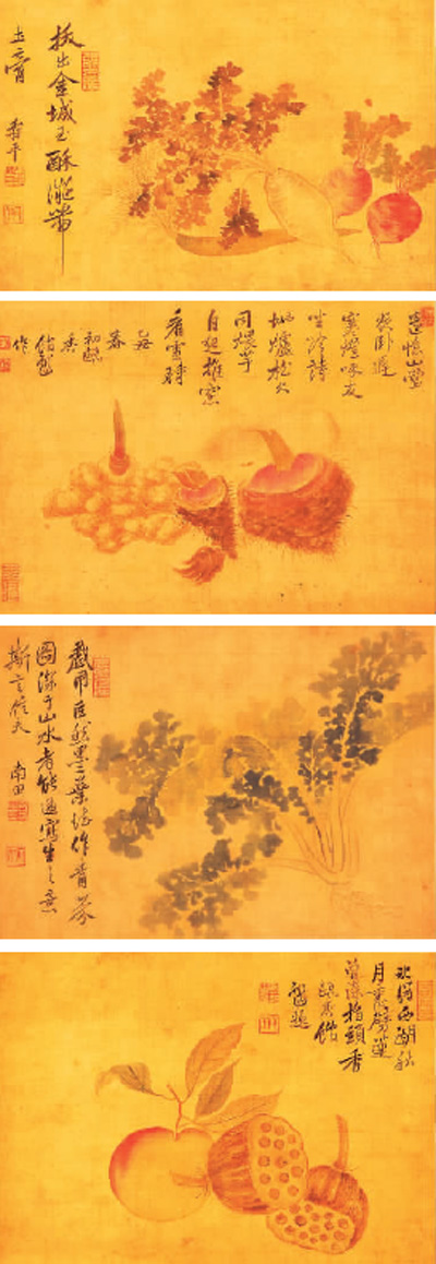 常州博物馆藏恽寿平四开《蔬果册页》代表了他的艺术造诣。蔬果主要以墨彩点染而成,色彩鲜艳却不滞重,用笔洒脱清隽,生机盎然。款字书法以王献之为体,褚遂良为面,黄庭坚为骨,优雅自然而不失法度谨严,与其画风相得益彰。从题款得知,恽寿平画此册时已53岁,是赁居瓯香馆时所作,合乎其“甚似则近俗,不似则离,惟能通笔外之意,随笔点染,生动有韵,斯免二障”的要求。