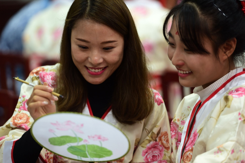 11月4日,河北省沧州市运河区水月寺小学的教师在学习绘制团扇。