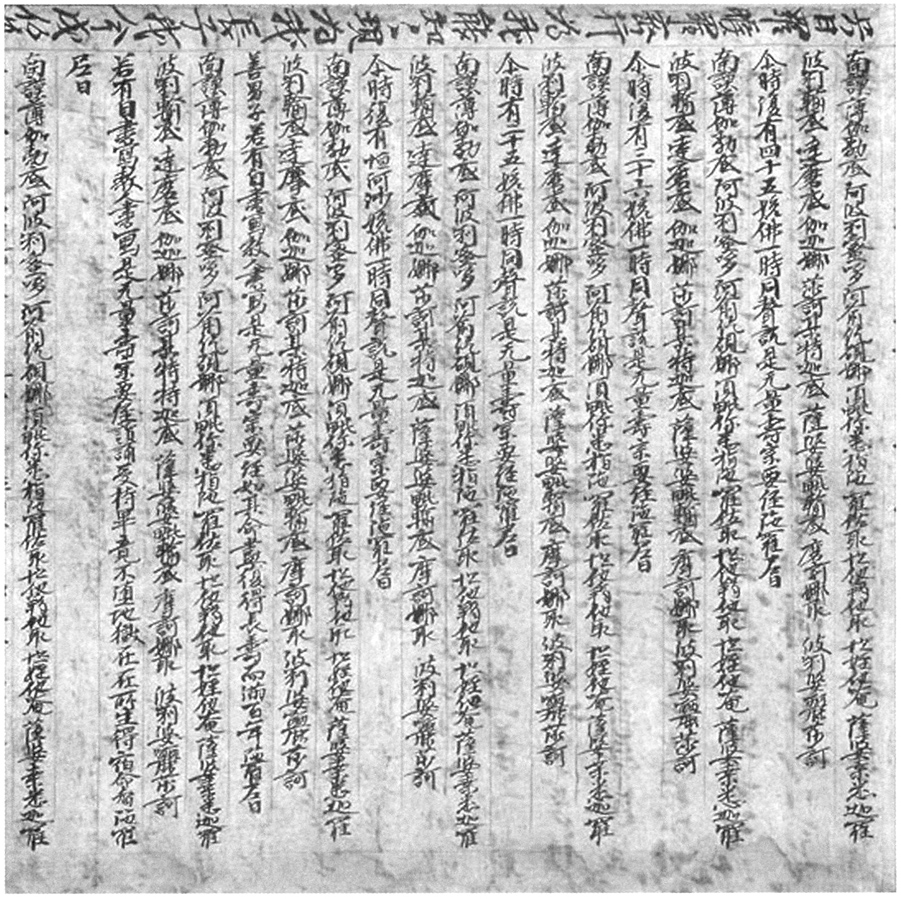 3.P.2105,该卷正面抄为《贤愚经》、《大悲真言》、《大宝积经文殊师利授记会》,卷背抄《金刚顶瑜伽念诵仪轨》。原卷《贤愚经》被分为两段,中间粘结《大悲真言》一组文献,其后又接《大宝积经》,因各文献纸张大小不一,故拼接痕迹非常明显(见图6)。卷背《金刚顶瑜伽念诵仪轨》为一人所抄,遇接纸痕不避。从写卷情况来看,抄手在拼合正面文献时,将同一卷《贤愚经卷第》割裂为二,全然不顾其内容的衔接,可知正面诸文献已遭废弃,其拼接目的旨在利用纸张反面,抄写卷背的《金刚顶瑜伽念诵仪轨》(见图7)。