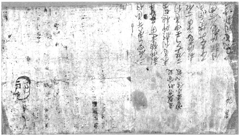 还有一种情况要特别注意,有时两卷相互拼合前,正反面就已经抄写了文书。这种情况也不少,如P.3882(见图8、图9)。该卷正面为残《孔子项讬相问书》14行与残《府君元清邈真赞并序》13行,卷背左侧画一罗汉头像,右侧抄《庚午年至甲戌年入破历算会牒》8行。原卷正面两文献皆为残片,其抄写字迹迥异,且其间有明显接纸痕,显为抄后拼接的两个残片。卷背《庚午年至甲戌年入破历算会牒》在《孔子项讬相问书》背后,且字迹与正面一致,罗汉头像在《府君元清邈真赞并序》卷背。从《算会牒》字迹不涉《邈真赞》背面的情况看,它应在粘结前就抄在《孔子项讬相问书》卷背了。即使是这样两片已经没有多少利用价值的文书残片,敦煌人也把它们粘结保存,他们对纸张的珍惜可见一斑。