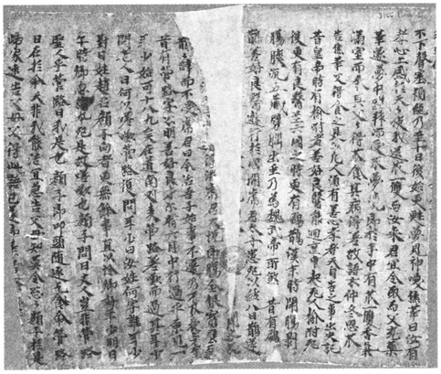 再如P.3451《张淮深变文》残卷。观本卷清晰彩图可见,原文自“自从司徒归阙后”开始,笔迹与前不一,字体稍大,用墨亦较前者浓重,考虑到该行前有明显的接纸痕,则此部分应为后人抄写补上的。此外原卷有朱笔,且有浓墨笔更改两处,一处改“尚书见贼已归降”句中“尚书”为“元戎”,一处改“尚书既擒回纥”句中“尚书”改为“仆射”,笔迹与后补内容一致。伏俊琏据此指出,该卷为在“张议潮变文”的基础上添补改造而的,可谓卓见③。除此之外,敦煌遗书面世后,一些藏书机构或个人也会对写卷进行一些拼接修复工作。如S.2630《唐太宗入冥记》抄卷,今存本文意不通,《敦煌变文校注》就指出此为英人在整理断片时将顺序接错所致。总之,写卷的拼接是个很复杂但同时也很重要的问题,我们在研究时必须注意结合图片或原卷深入探究。